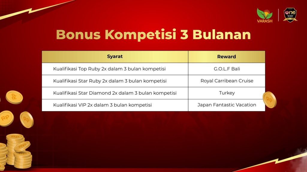 5. Berkesempatan mendapat bonus kompetisi bulanan dan 3 bulanan mulai dari Tour ke Bali, Naik Kapal Pesiar dan Tour luar negeri.