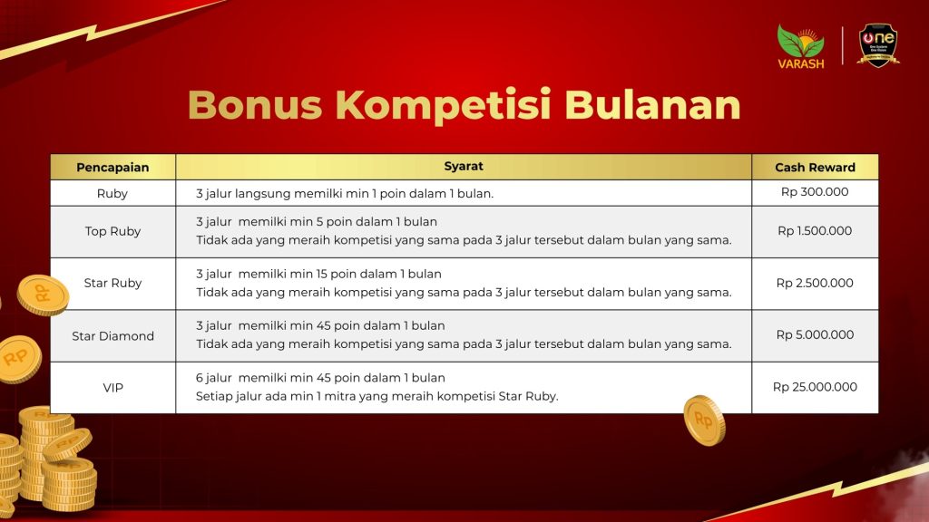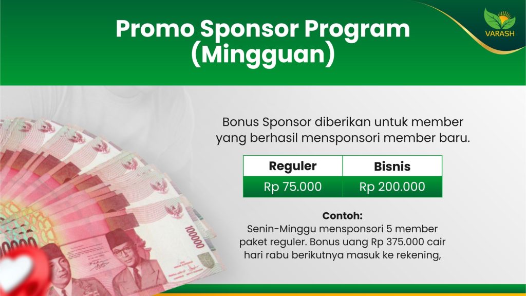 Bagi yang sudah menjadi member Varash kalau bisa mengajak orang bergabung di Varash akan mendapatkan bonus sponsor / bonus rekrut yang dibayar setiap minggu.