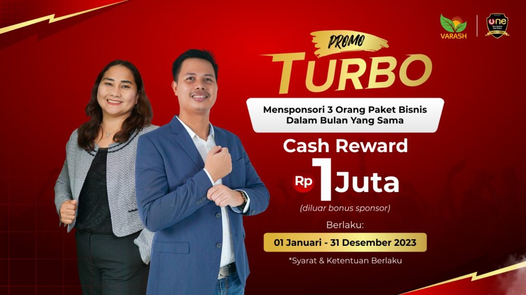Bagi anda yang bisa mengajak 3 orang bergabung paket bisnis dalam 1 bulan maka anda akan tembus yang namanya PROMO TURBO dan berhak mendapatkan reward tambahan senilai 1.000.000. Kalau ditotal dengan bonus sponsor jadinya anda mendapatkan bonus 1.600.000.