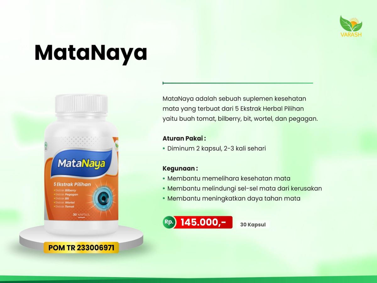MataNaya adalah sebuah suplemen kesehatan mata yang terbuat dari 5 Ekstrak Herbal Pilihan yaitu buah tomat, bilberry, bit, wortel, dan pegagan.